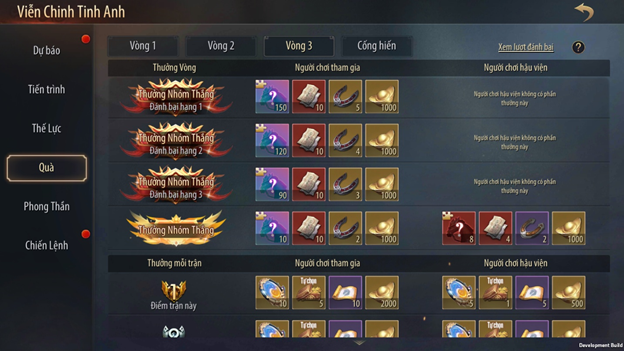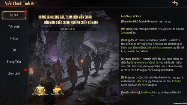 - Mô tả nhanh: Viễn Chinh Tinh Anh sẽ được chia thành nhiều khu đấu (tương tự Đấu Đỉnh Cao), mỗi khu gồm 16 server có thực lực tương đương. Mỗi server sẽ đề cử ra 20 đại diện mạnh nhất tham chiến. Các server sẽ tiến hành thi đấu theo hình thức tương tự Thành Chiến, trải qua nhiều giai đoạn với thời gian diễn ra được thông báo trước. Sau khi kết thúc toàn bộ giai đoạn, server có điểm thi đấu cao nhất sẽ trở thành Quán Quân của khu đấu đó.